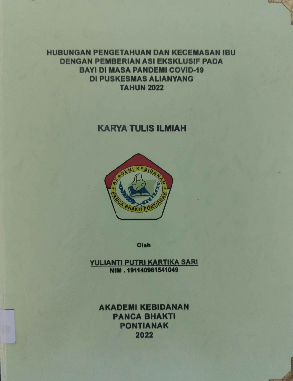 Kesimpulan tidak ada hubungan antara pengetahuan dan kecemasan ibu dengan pemberian ASI Eksklusif pada bayi dimasa pandemi covid-19 di Puskesmas Alianyang tahun 2022.