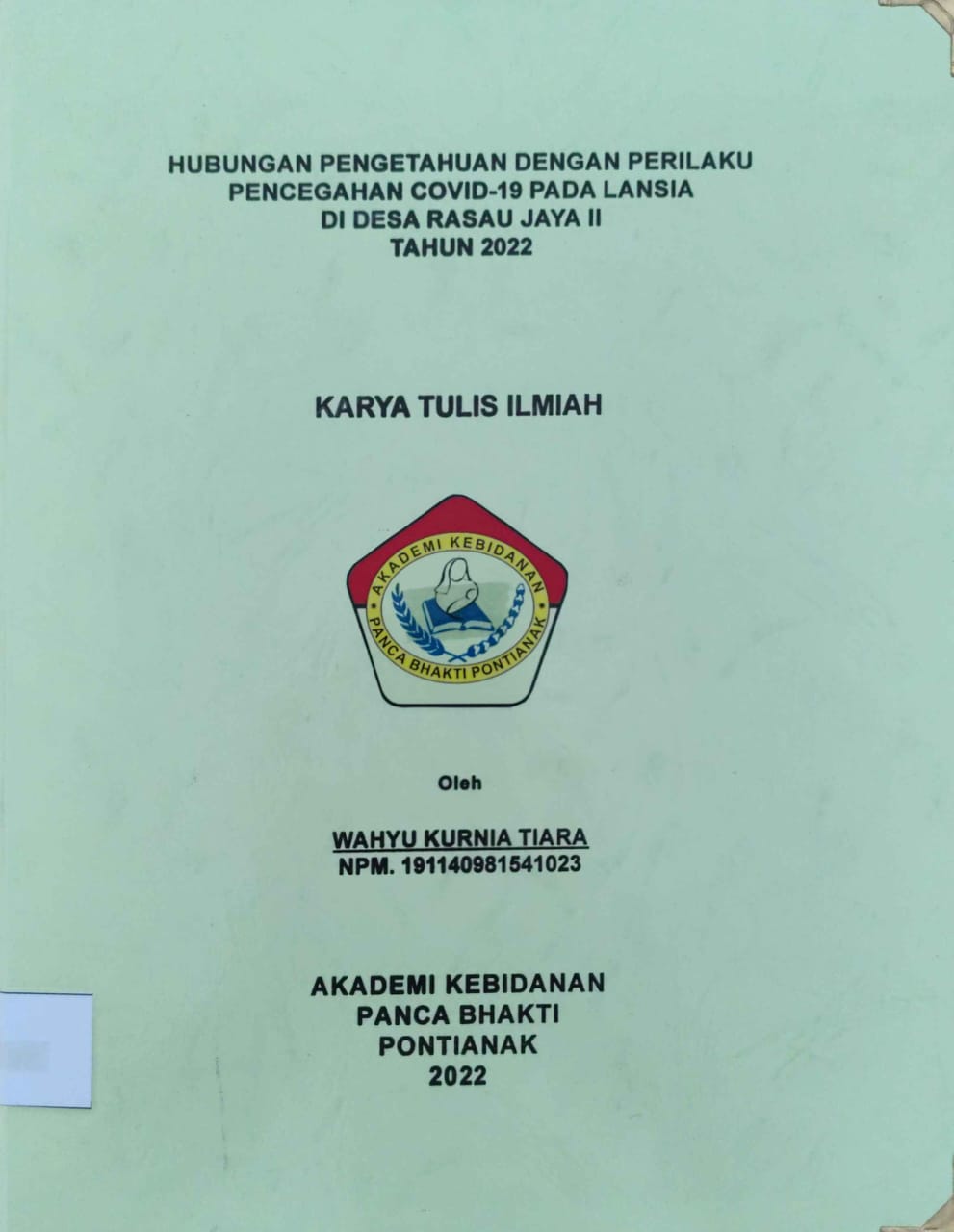 Covid-19 adalah virus jenis baru yang belum pernah diidentifikasi sebelumnya pada manusia. Virus ini dinamakan Sars-CoV-2 yang dapat menular dari manusia ke manusia melalui percikan batuk atau bersin. Kelompok lansia di masa pandemic Covid-19 adalah kelompok masyarakat yang paling rentan terdampak kesehatan fisiknya. Adapun pencegahan Covid- 19 yaitu dengan menerapkan protokol kesehatan 5M seperti menggunakan masker, membersihkan tangan, menjaga jarak, menjauhi kerumunan dan membatasi mobilitas. Penelitian ini bertujuan untuk mengetahui apakah ada hubungan antara pengetahuan dengan perilaku pencegahan Covid-19 pada lansia di Desa Rasau Jaya II Tahun 2022. Metode penelitian ini menggunakan metode deskriptif korelasi dengan pendekatan Cross Sectional. Populasi dalam penelitian ini adalah seluruh lansia yang ada di Desa Rasau Jaya II. Sampel dalam penelitian ini adalah sebanyak 52 orang. Teknik sampling yang digunakan dalam penelitian ini adalah Accidental Sampling, dan analisis dalam penelitian ini yaitu menggunakan analisis univariat dan analisis bivariat. Hasil pengumpulan data terhadap 52 responden didapatkan sebagian responden 23 orang (44,2%) berpengetahuan baik dan sebagian dari responden 33 responden (63,5%) dengan perilaku melakukan dalam pencegahan covid-19. Hasil Chi Square p value 0,114>0,05 sehingga Ho diterima yang menyatakan bahwa tidak ada hubungan antara pengetahuan dengan perilaku pencegahan Covid-19 pada lansia di Desa Rasau Jaya II Tahun 2022.